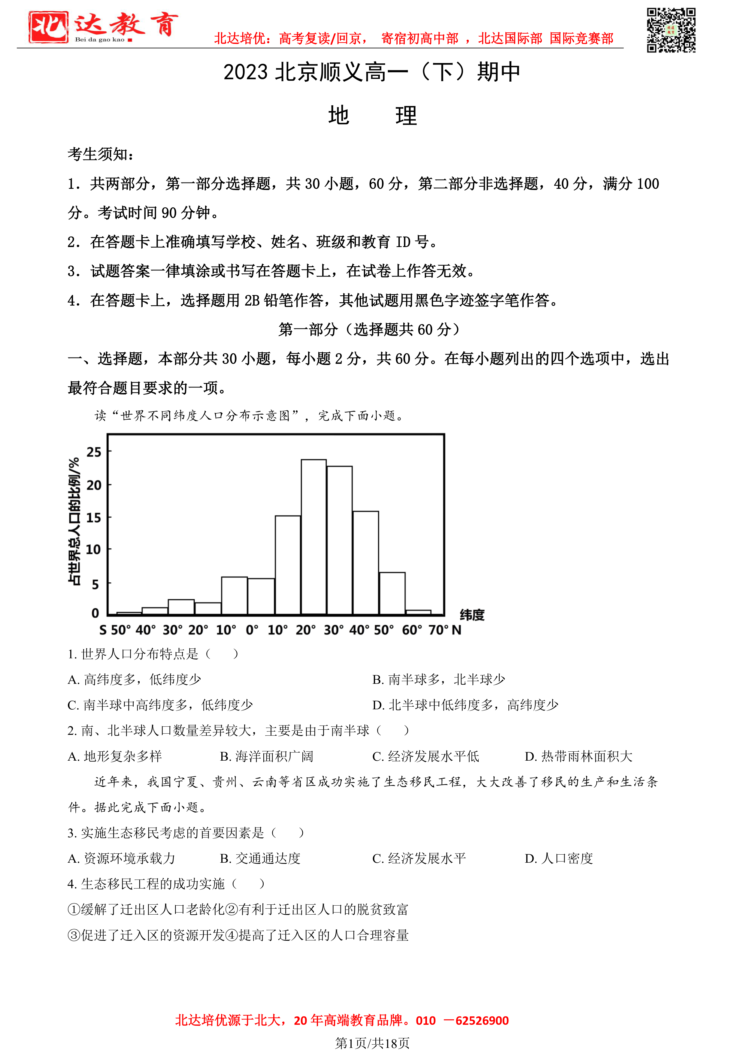2022-2023学年北京各区高一年级下学期期中考试已开始,北达高考复读学校整理了2022-2023学年北京顺义高一(下)期中地理试题及答案,供同学们在线下载!