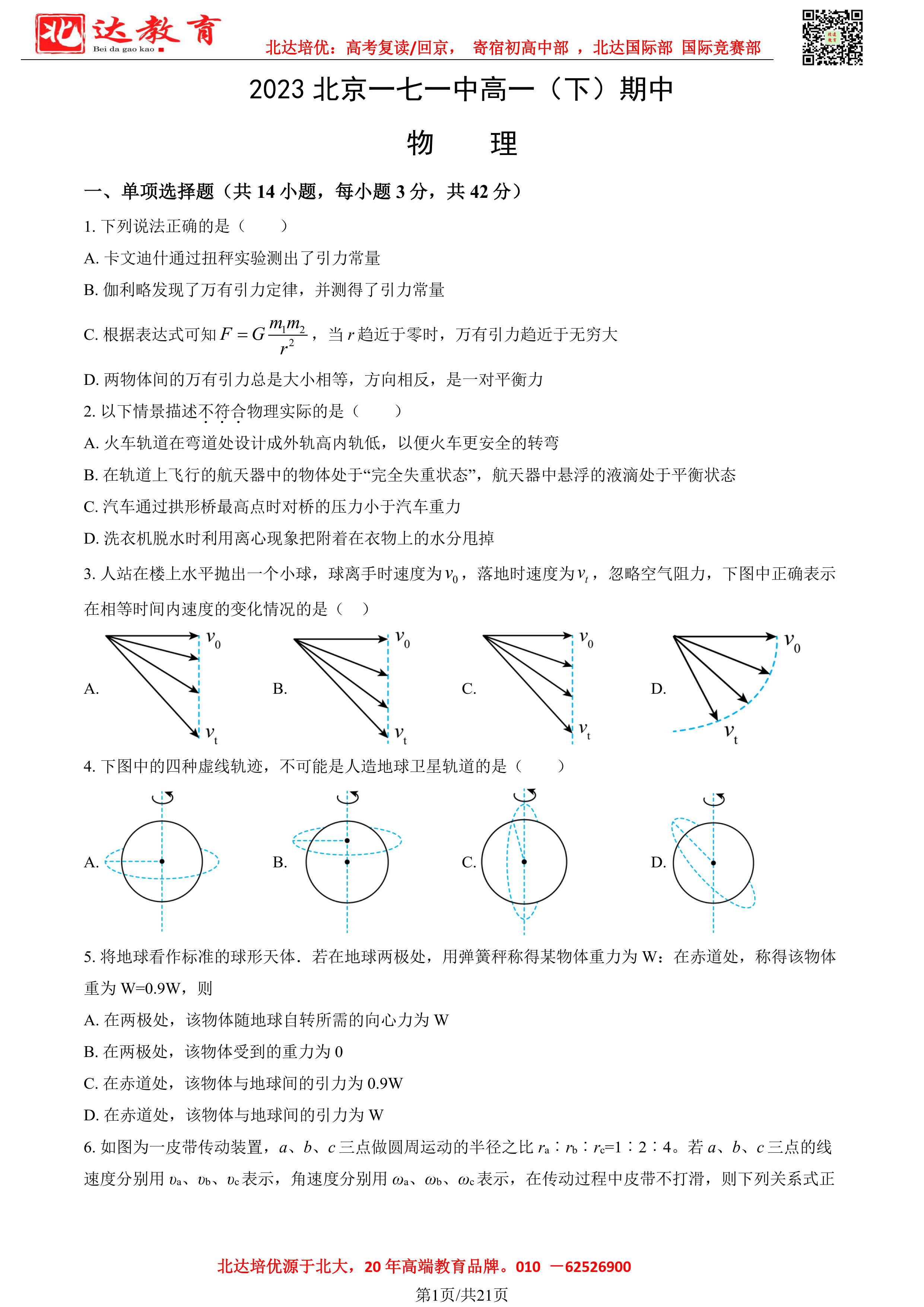 2022-2023学年北京各区高一年级下学期期中考试已开始,北达高考复读学校整理了2022-2023学年北京一七一中高一(下)期中物理试题及答案,供同学们在线下载!