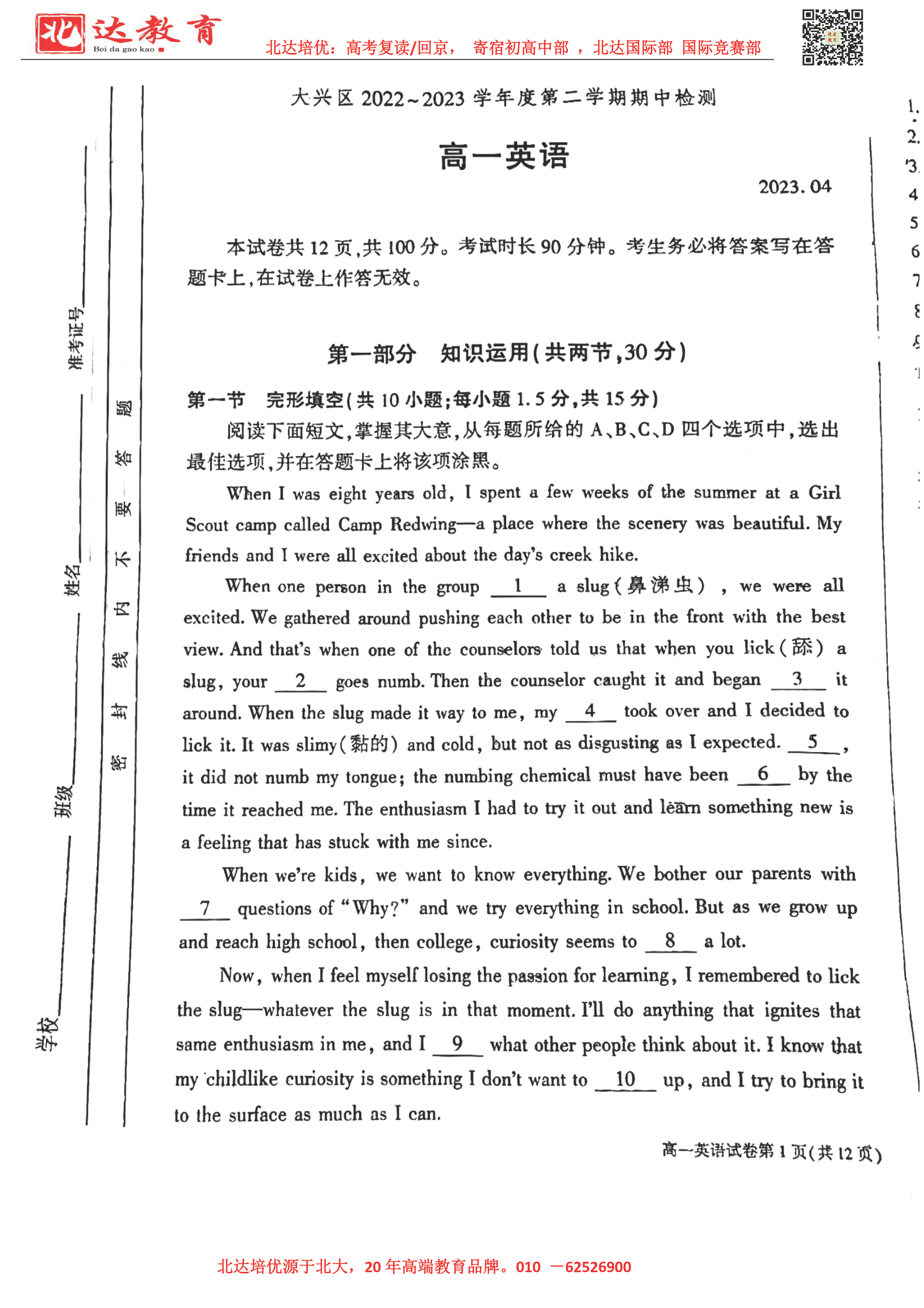2022-2023学年北京各区高一年级下学期期中考试已开始,北达高考复读学校整理了2022-2023学年北京大兴高一(下)期中英语试题及答案,供同学们在线下载!
