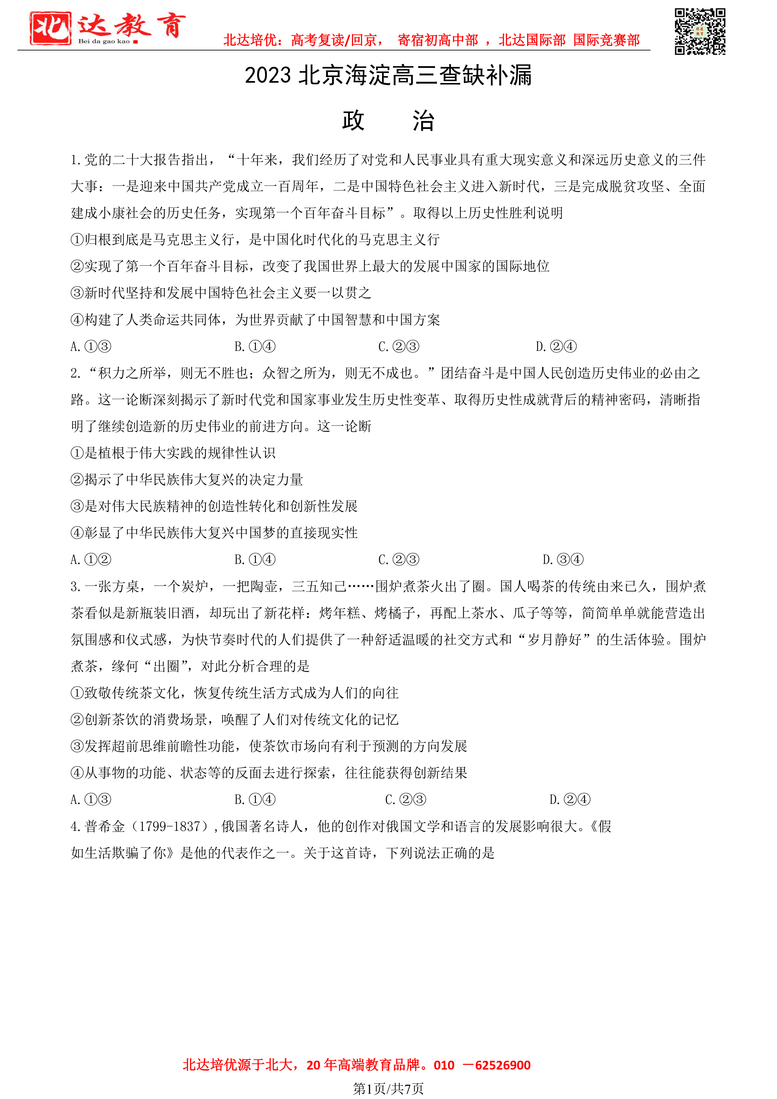 2023年北京海淀高三二模考试已结束,北达高考复读学校整理了政治查漏补缺材料试题及答案,分享给同学们。详情如下: