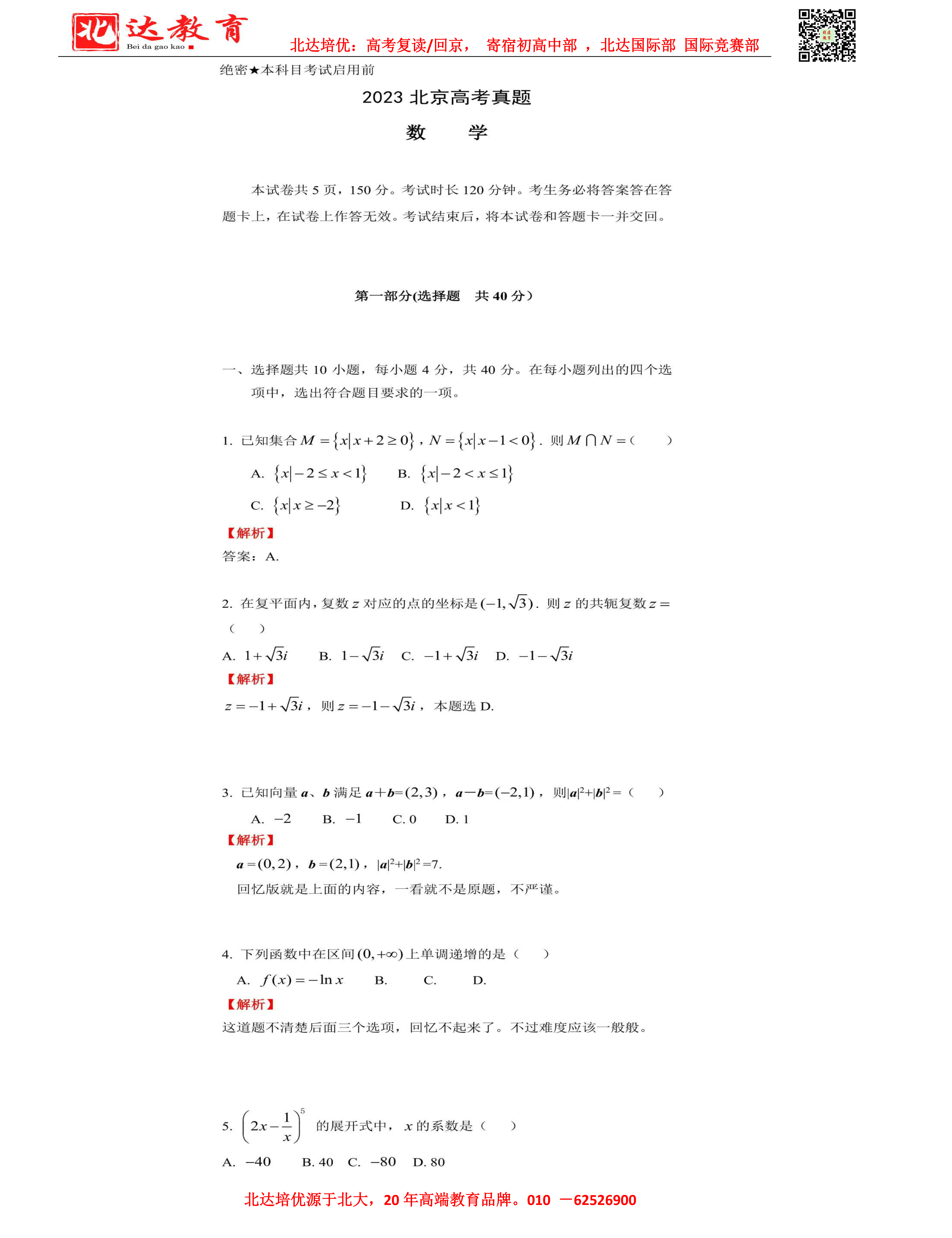 2023全国高考考试已结束,为了方便同学们查找高考试题答案进行估分,北达复读学校整理了2023年北京高考数学试题答案解析,分享给同学们。详情如下: