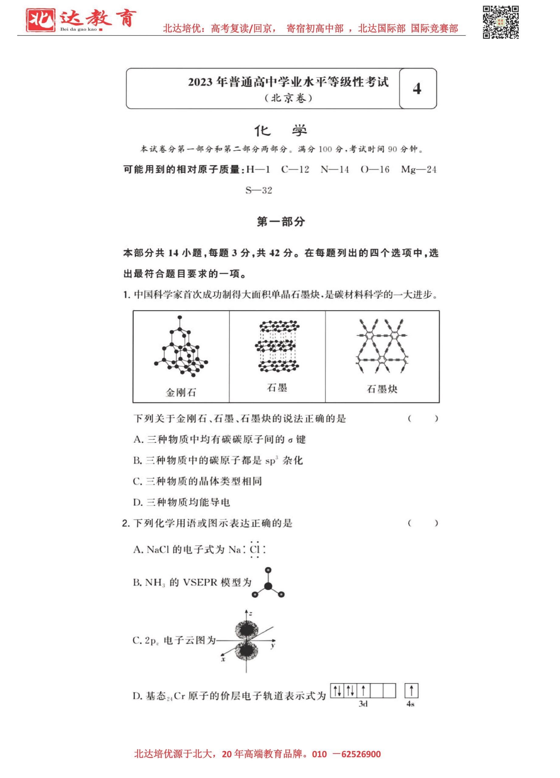 2023全国高考考试已结束,为了方便同学们查找高考试题答案进行估分,北达复读学校整理了2023年北京高考化学试题及答案,分享给同学们。详情如下:
