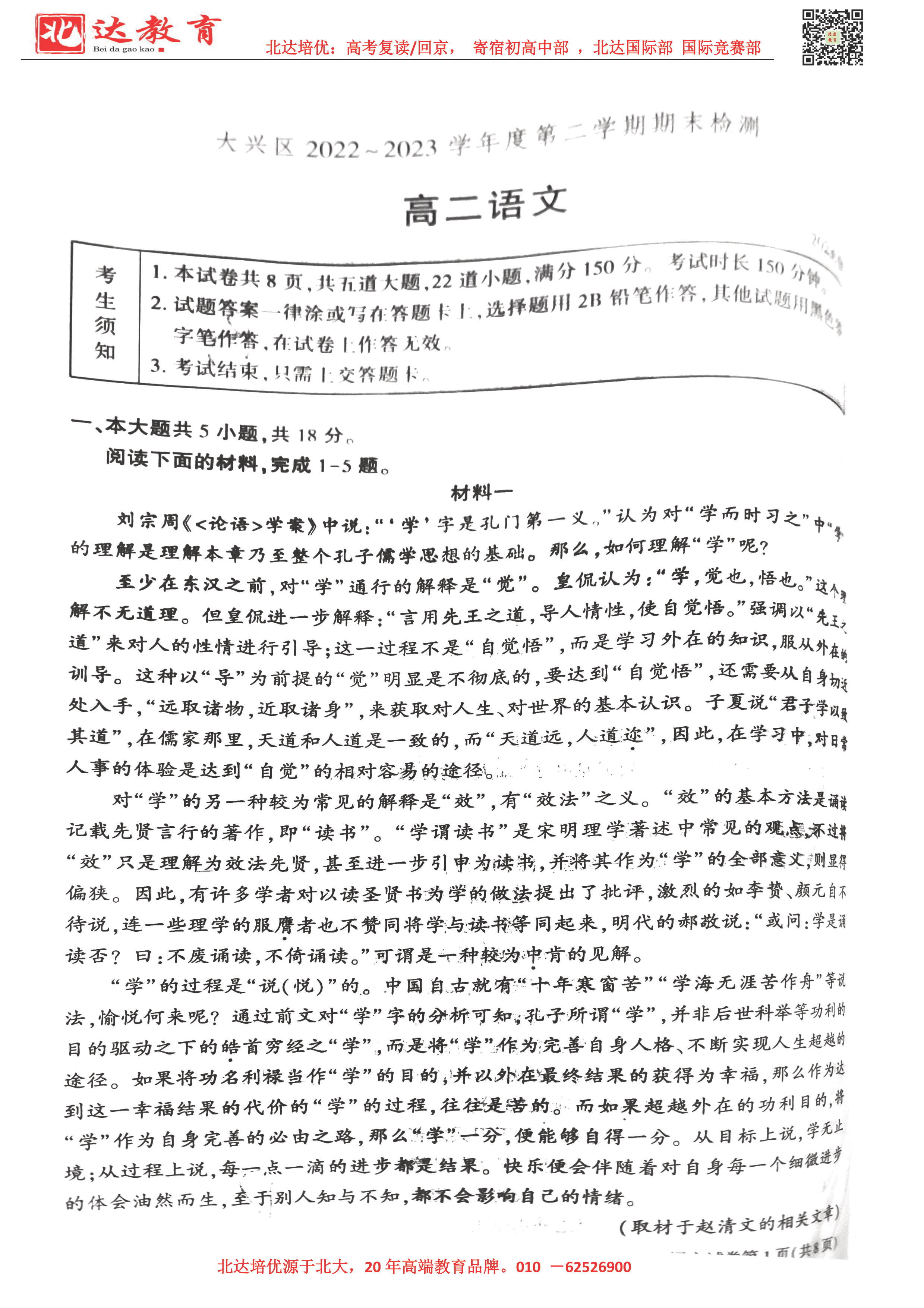 北京市2022-2023年高二下学期期末考试7月5日开考,为了帮助考生更好的核对考试答案,北达复读学校整理了2022-2023学年北京大兴区高二下学期期末语文试题,供考生参考。