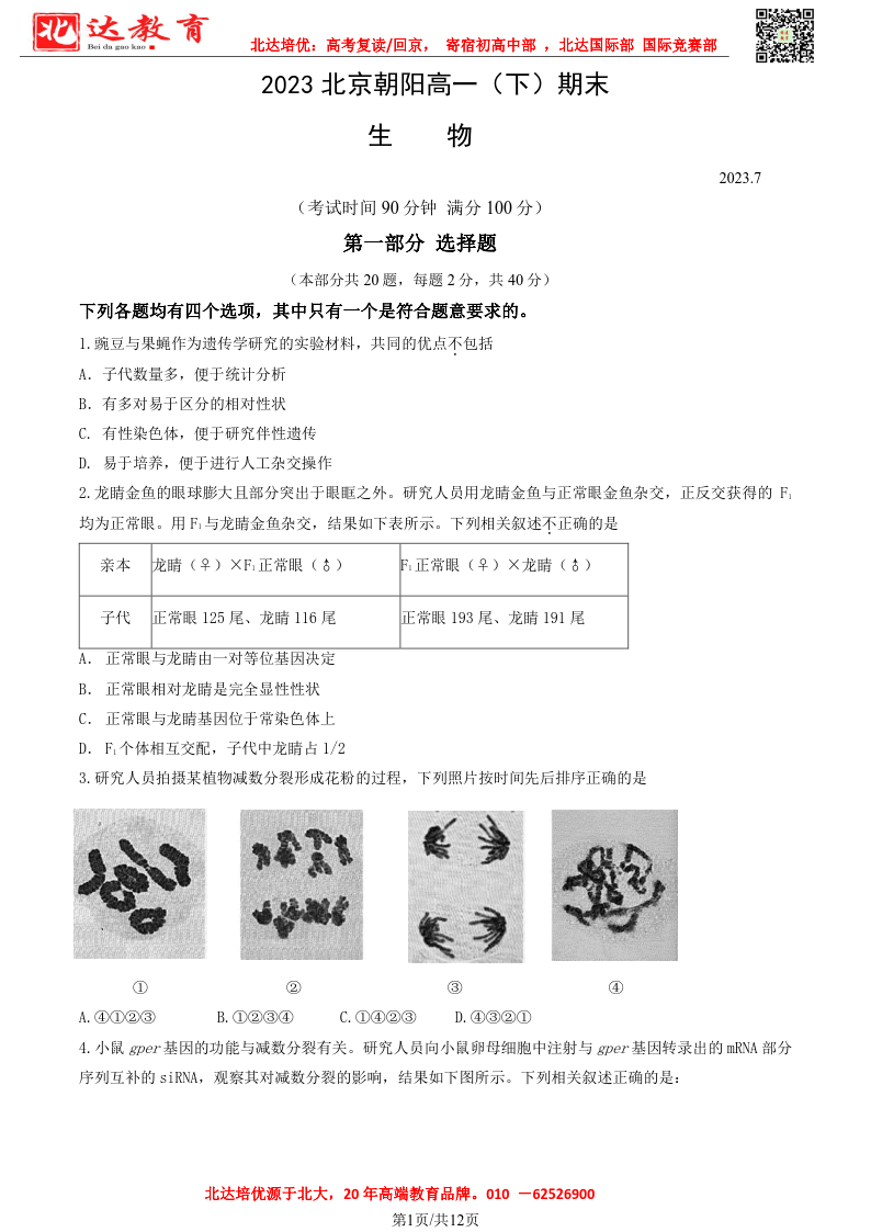 北京市2022-2023年高一下学期期末考试即将开考,为了帮助考生更好的核对考试答案,北达复读学校整理了2022-2023学年北京朝阳区高一下学期期末生物试题及答案,供考生参考。