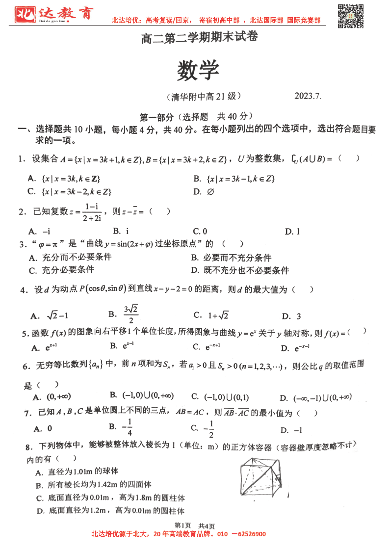 北京市2022-2023年高二下学期期末考试即将开考,为了帮助考生更好的核对考试答案,北达复读学校整理了2022-2023学年清华附中高二下学期期末数学试题,供考生参考。