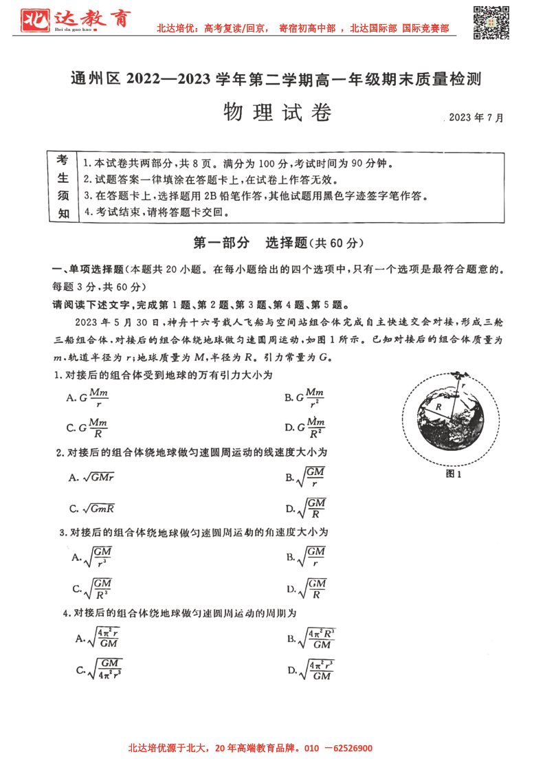 北京市2022-2023年高一下学期期末考试即将开考,为了帮助考生更好的核对考试答案,北达复读学校整理了2022-2023学年北京通州区高一下学期期末物理试题,供考生参考。