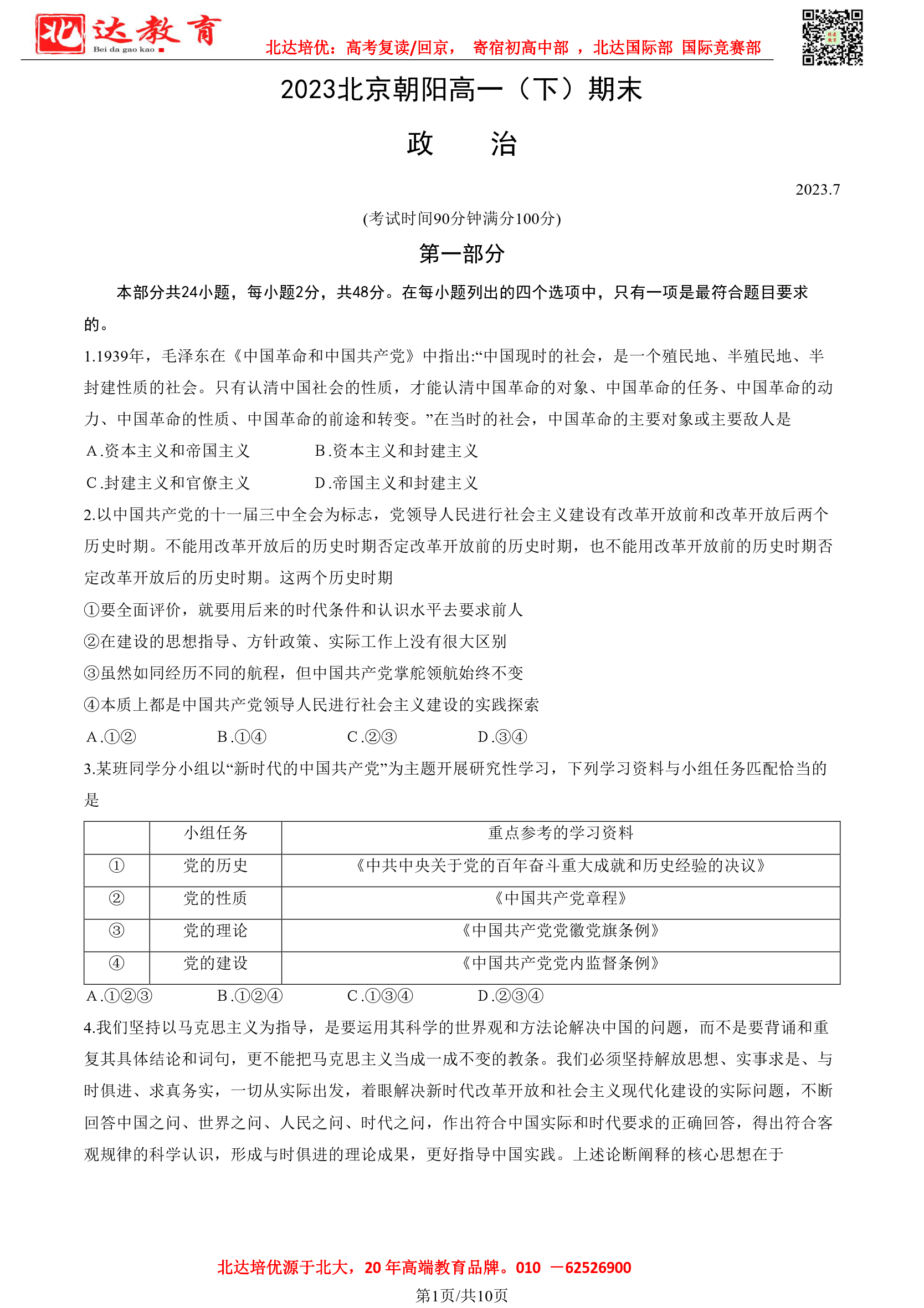 北京市2022-2023年高一下学期期末考试即将开考,为了帮助考生更好的核对考试答案,北达复读学校整理了2022-2023学年北京朝阳区高一下学期期末政治试题及答案,供考生参考。