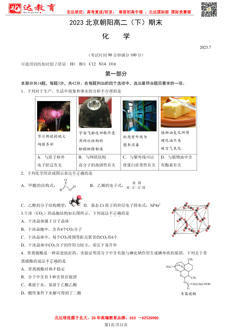 北京市2022-2023年高二下学期期末考试即将开考,为了帮助考生更好的核对考试答案,北达复读学校整理了2022-2023学年北京朝阳区高二下学期期末化学试题及答案,供考生参考。