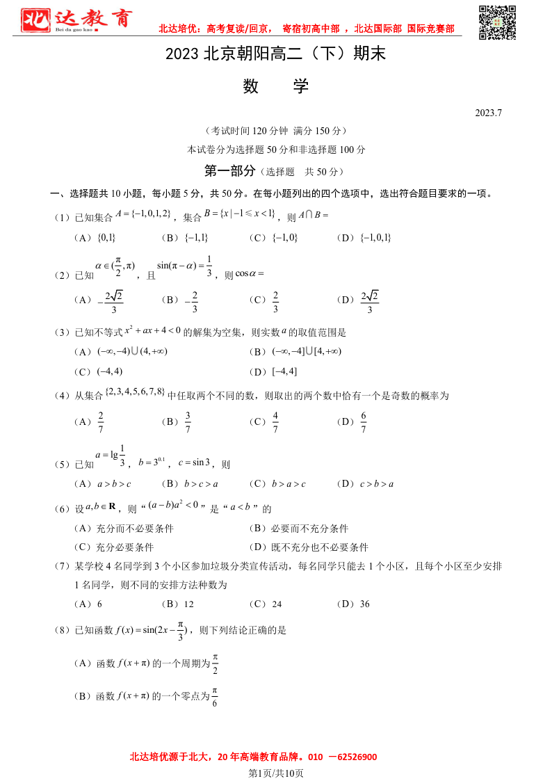 北京市2022-2023年高二下学期期末考试即将开考,为了帮助考生更好的核对考试答案,北达复读学校整理了2022-2023学年北京朝阳区高二下学期期末数学试题及答案,供考生参考。