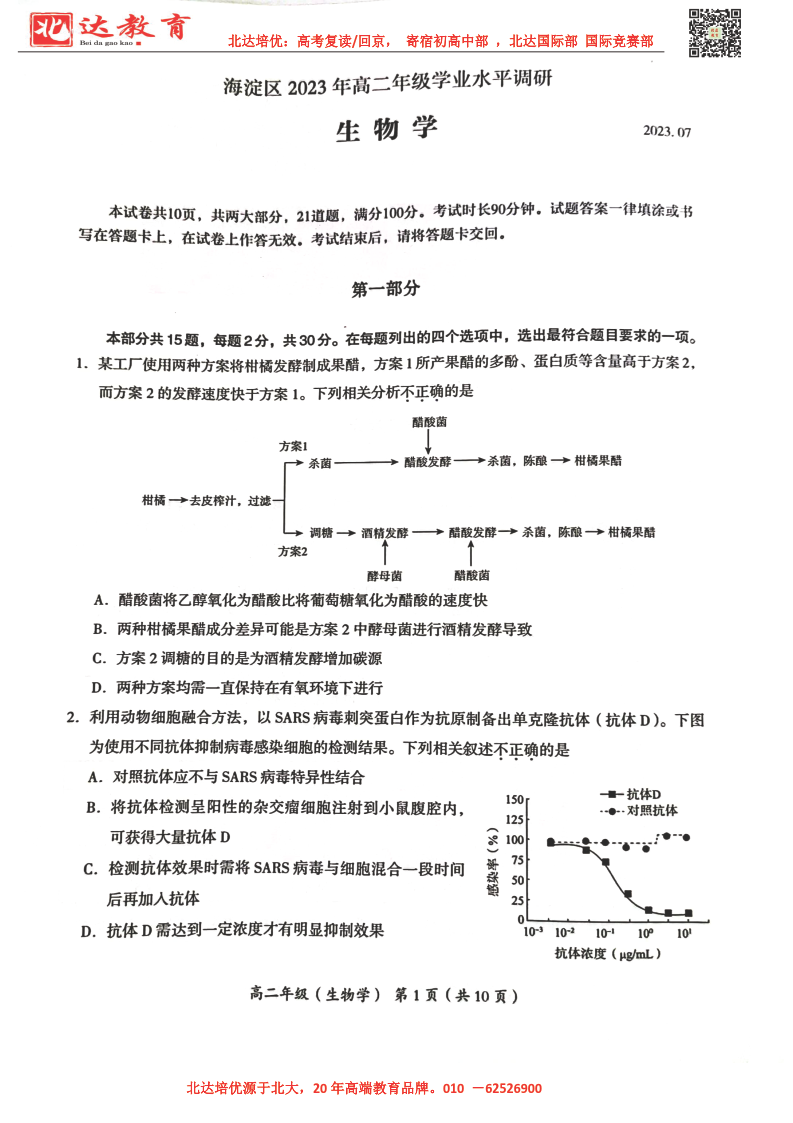 北京市2022-2023年高二下学期期末考试即将开考,为了帮助考生更好的核对考试答案,北达复读学校整理了2022-2023学年北京海淀区高二下学期期末生物试题及答案,供考生参考。