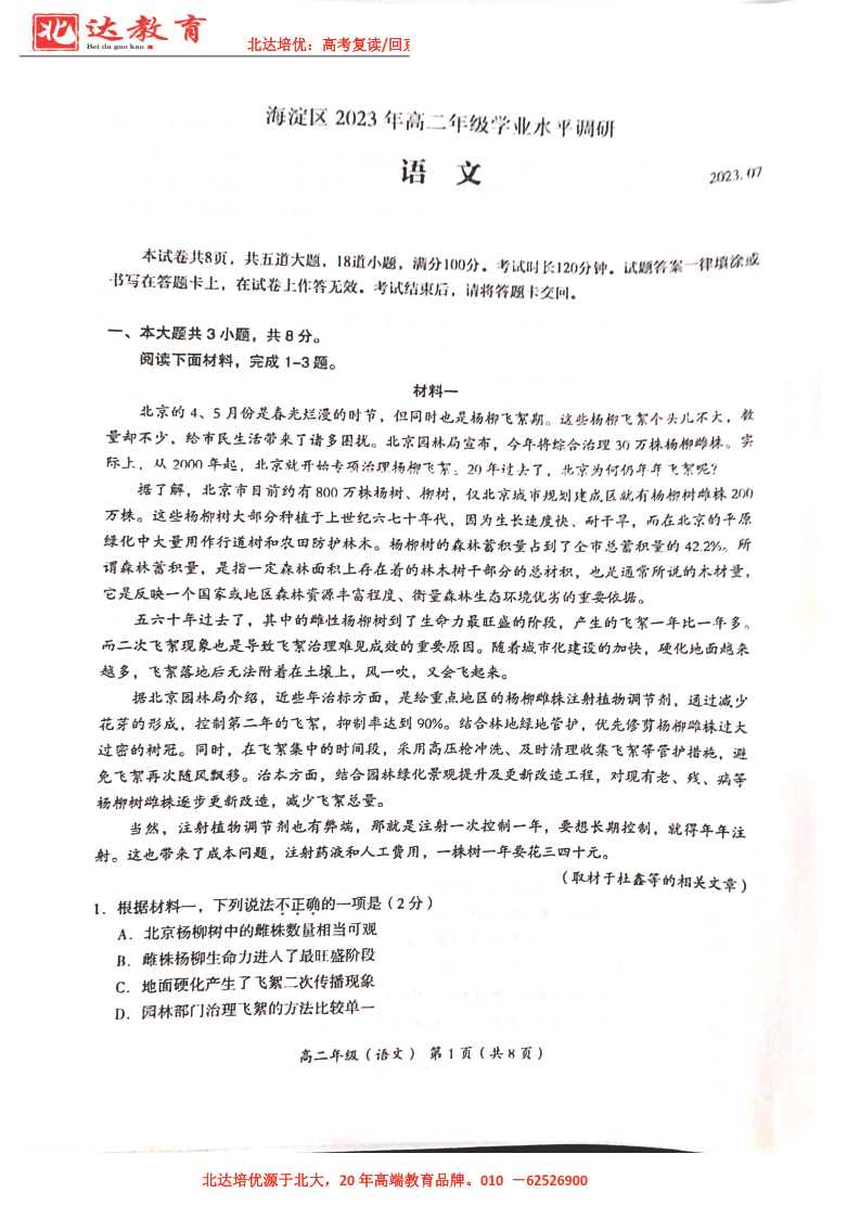 北京市2022-2023年高二下学期期末考试即将开考,为了帮助考生更好的核对考试答案,北达复读学校整理了2022-2023学年北京海淀区高二下学期期末语文试题及答案,供考生参考。