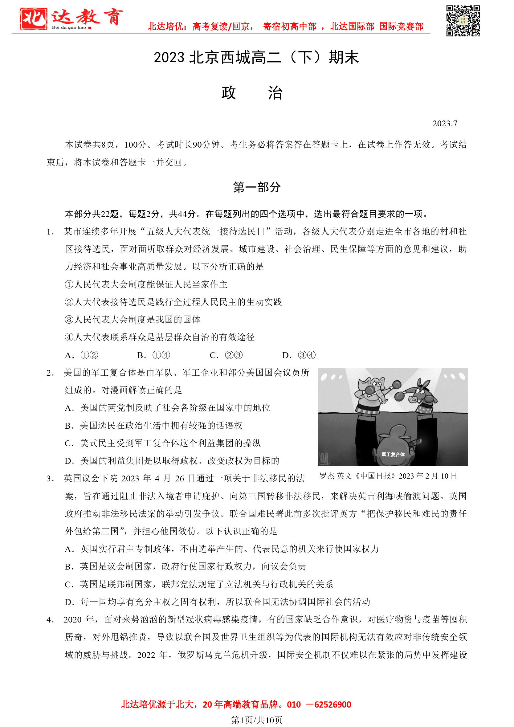 北京市2022-2023年高二下学期期末考试即将开考,为了帮助考生更好的核对考试答案,北达复读学校整理了2022-2023学年北京西城区高二下学期期末政治试题及答案,供考生参考。