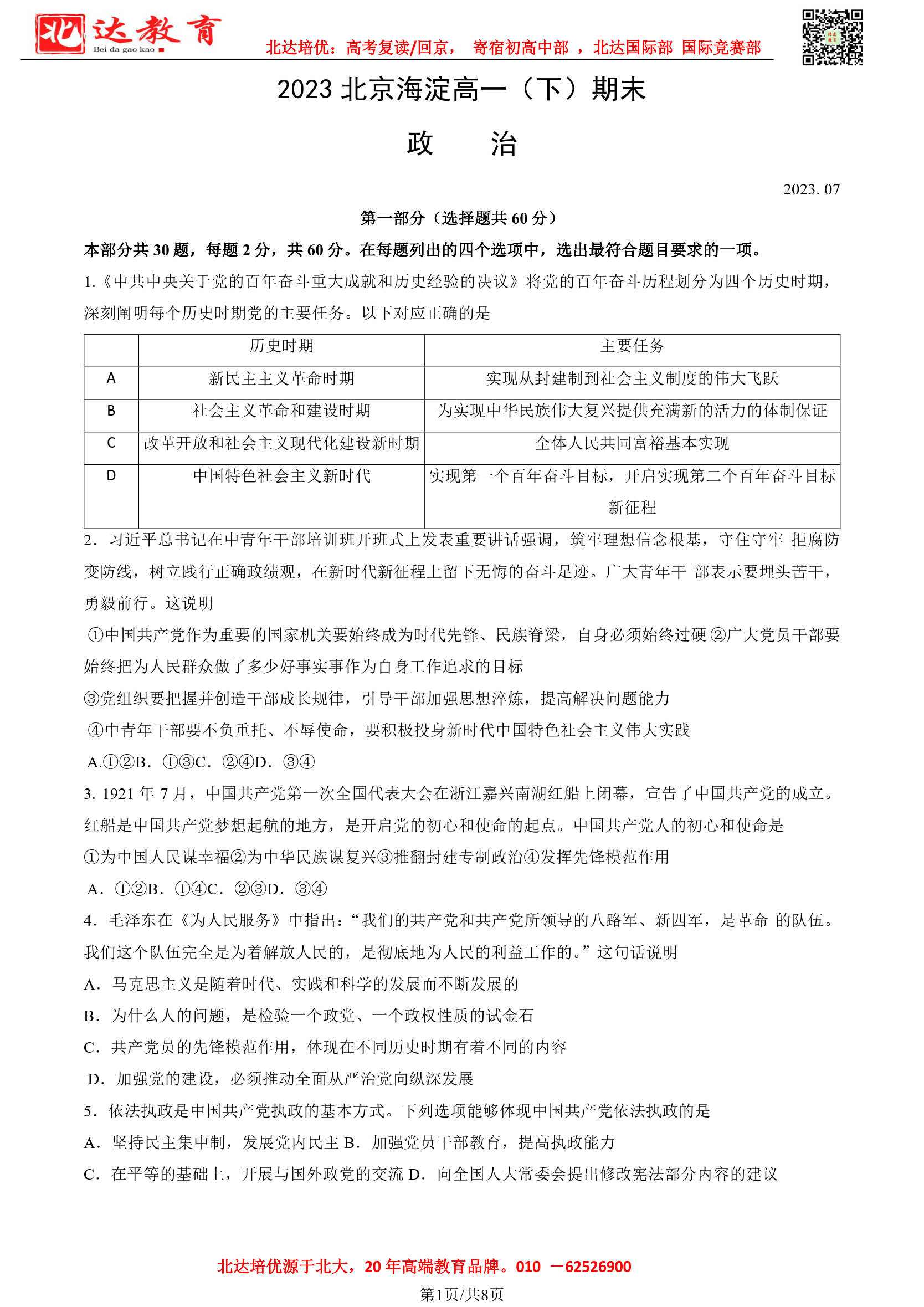 北京市2022-2023年高一下学期期末考试即将开考,为了帮助考生更好的核对考试答案,北达复读学校整理了2022-2023学年北京海淀区高一下学期期末政治试题,供考生参考。