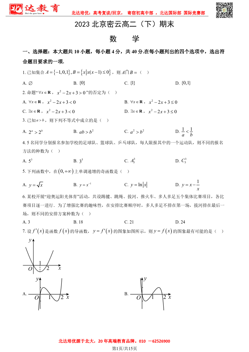 北京市2022-2023年高二下学期期末考试即将开考,为了帮助考生更好的核对考试答案,北达复读学校整理了2022-2023学年北京密云高二下学期期末数学试题及答案,供考生参考。