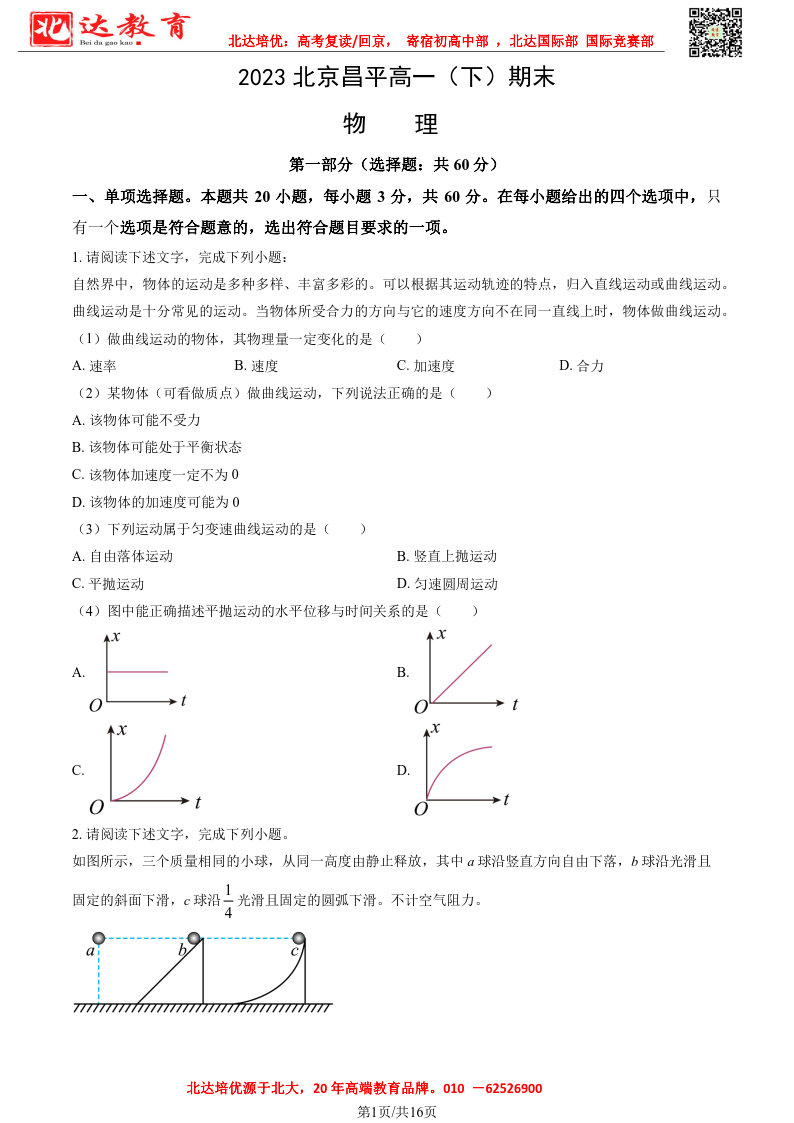 北京市2022-2023年高一下学期期末考试即将开考,为了帮助考生更好的核对考试答案,北达复读学校整理了2022-2023学年北京昌平区高一下学期期末物理试题及答案,供考生参考。