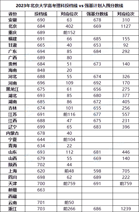 从强基入围分数线来看,2023年北大除安徽、河北、山东三省分数线略低于清华外,在其他省份的强基入围分数线均高于清华,其中分数差距最大的为黑龙江省,北大强基入围分数线高于清华10分,而位次差距最大的为浙江省,位次相差448位。