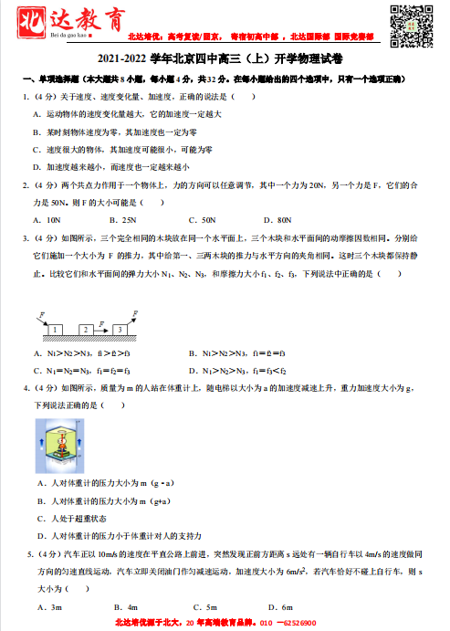 2023年北京高三开学考如期开考,北达高考复读学校整理了部分物理试题考卷与答案,供各位考生参考,点击下方链接还可以下载电子版。