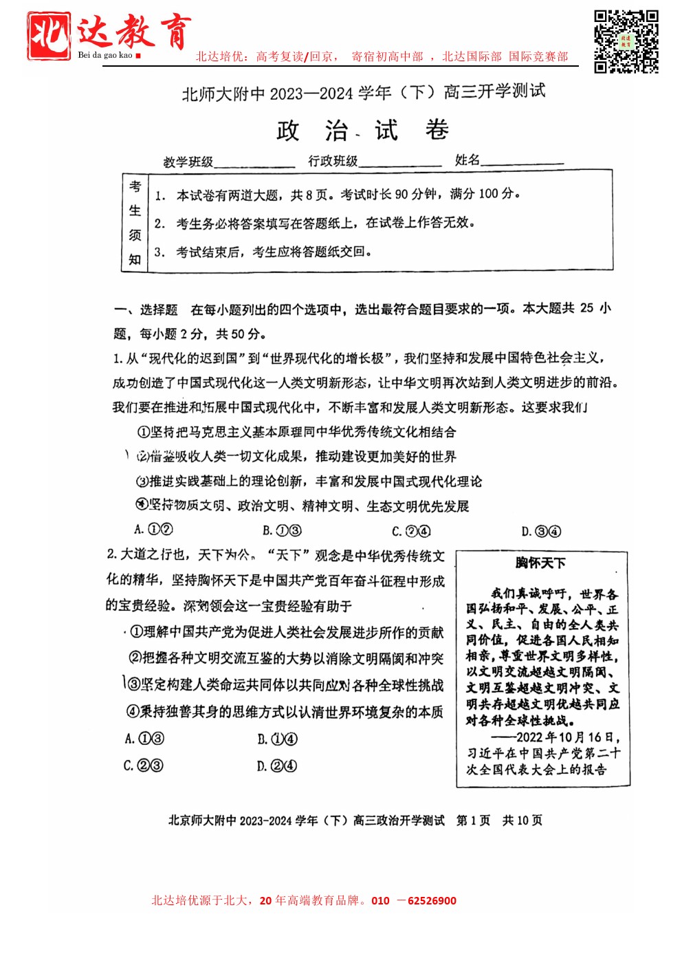 2024北京各中学高三开学考已结束,为了方便同学们查找相关试题,北达高考网特意整理了2024北师大附中高三下开学考政治试题及答案,需要的同学赶紧下载练习吧。