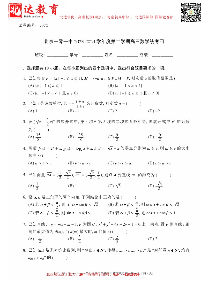 2024北京各中学高三开学考已结束,为了方便同学们查找相关试题,北达高考网特意整理了2024北京一零一中高三下开学考数学试题及答案,需要的同学赶紧下载练习吧。