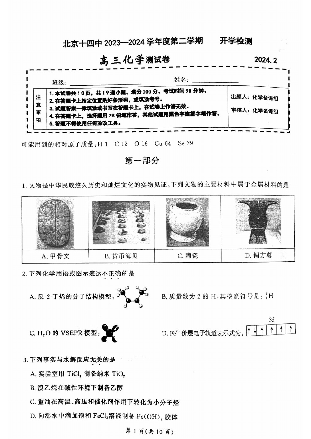 2024北京各中学高三开学考已结束,为了方便同学们查找相关试题,北达高考网特意整理了2024北京十四中高三下开学考化学试题及答案,需要的同学赶紧下载练习吧。
