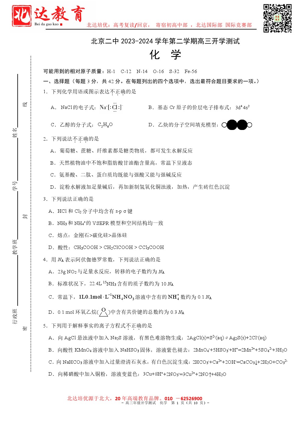 2024北京各中学高三开学考已结束,为了方便同学们查找相关试题,北达高考网特意整理了2024北京二中高三下开学考化学试题及答案,需要的同学赶紧下载练习吧。