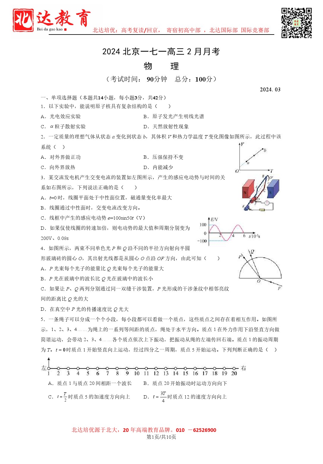 2024北京各中学高三开学考已结束,为了方便同学们查找相关试题,北达高考网特意整理了2024北京一七一中高三下开学考物理试题及答案,需要的同学赶紧下载练习吧。