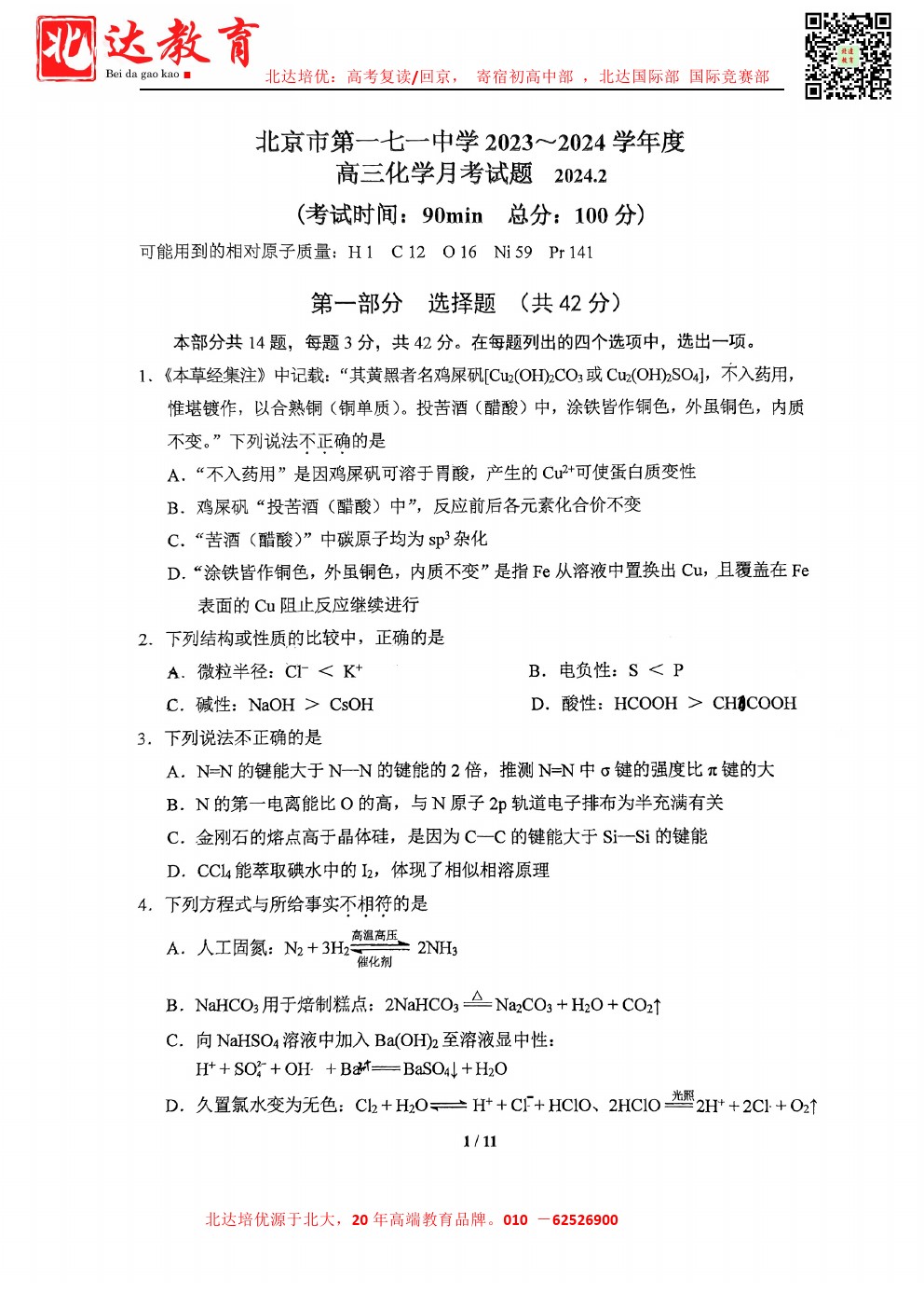 2024北京各中学高三开学考已结束,为了方便同学们查找相关试题,北达高考网特意整理了2024北京一七一中高三下开学考化学试题,需要的同学赶紧下载练习吧。