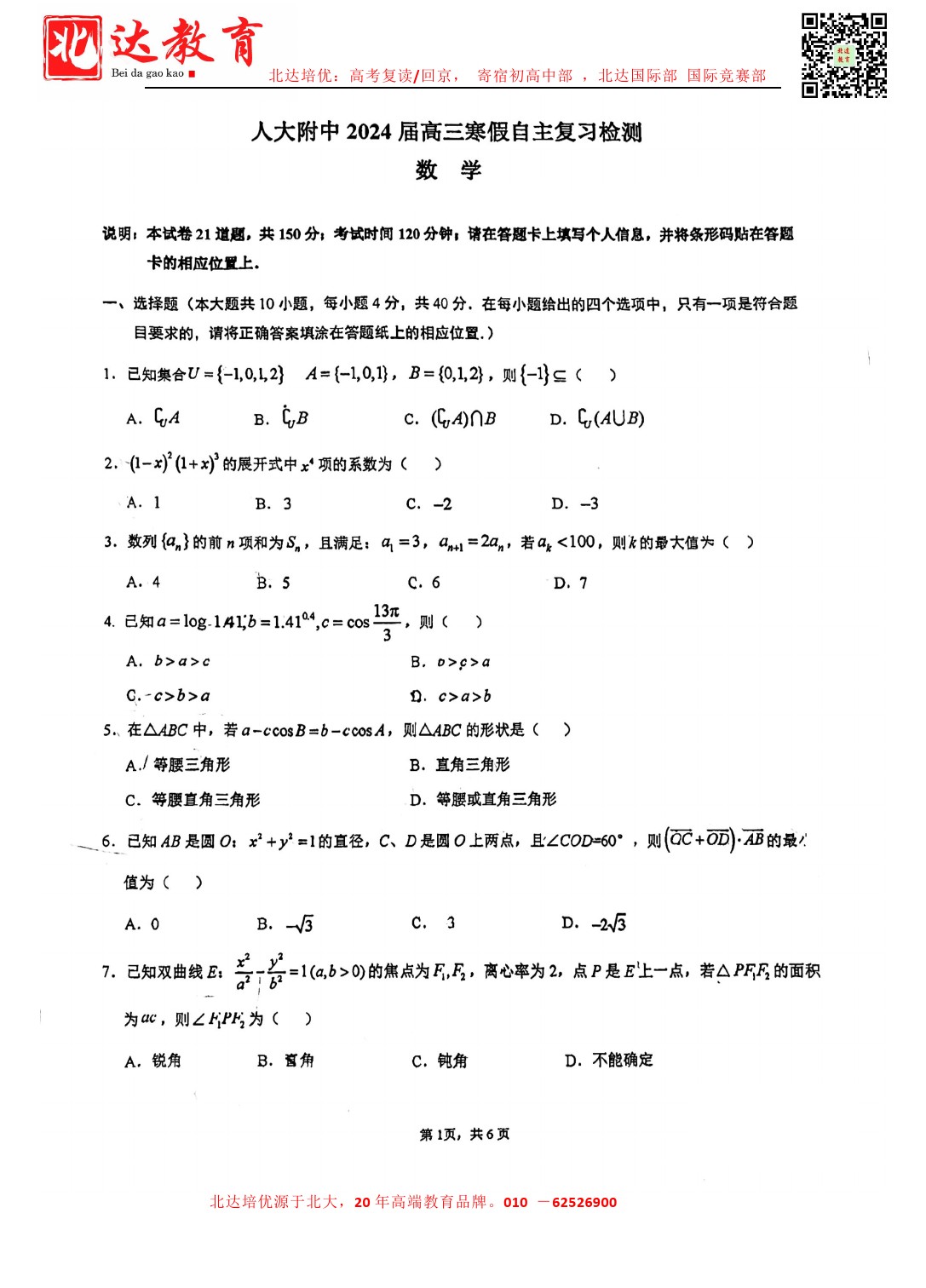 2024北京各中学高三开学考已结束,为了方便同学们查找相关试题,北达高考网特意整理了2024北京人大附中高三下开学考数学试题,需要的同学赶紧下载练习吧。