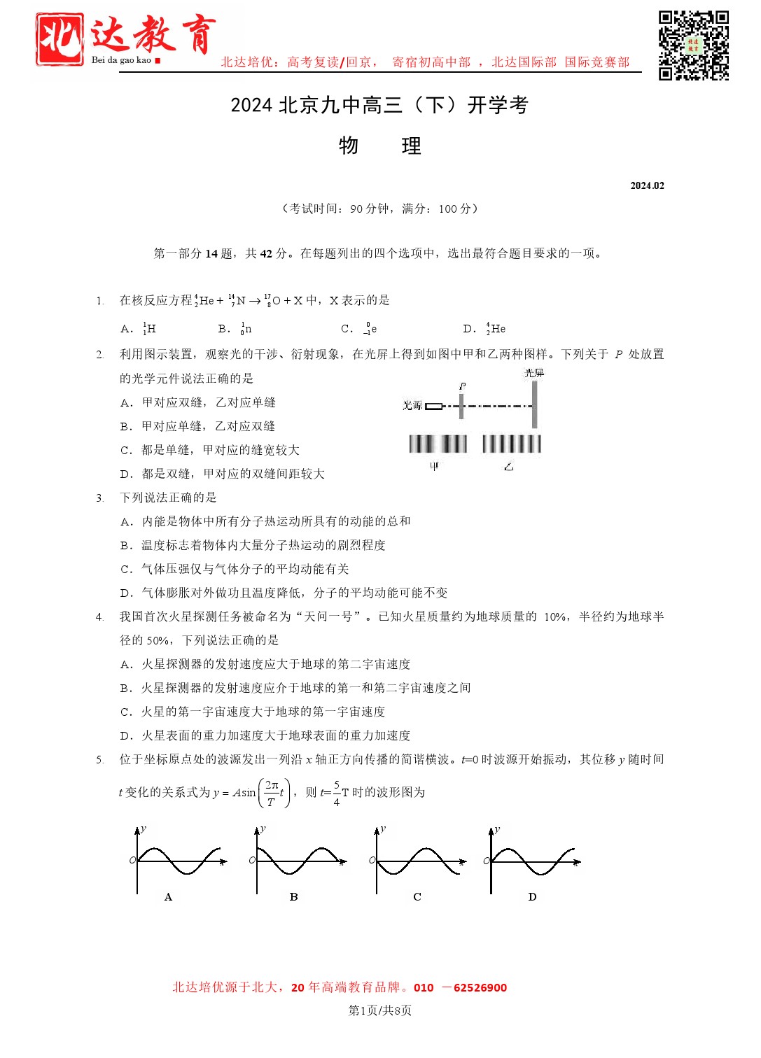 2024北京各中学高三开学考已结束,为了方便同学们查找相关试题,北达高考网特意整理了2024北京九中高三下开学考物理试题及答案,需要的同学赶紧下载练习吧。
