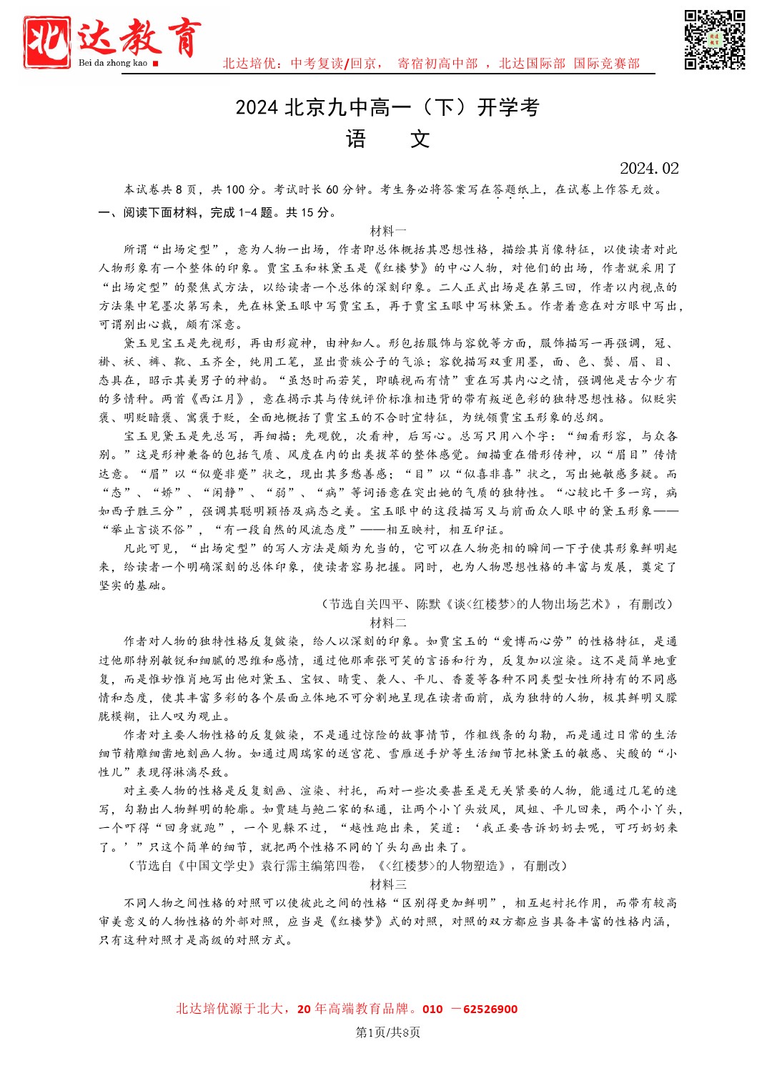 2024北京各中学高一开学考已结束,为了方便同学们查找相关试题,北达高考网特意整理了2024北京九中高一(下)开学考语文试题及答案,需要的同学赶紧下载练习吧。
