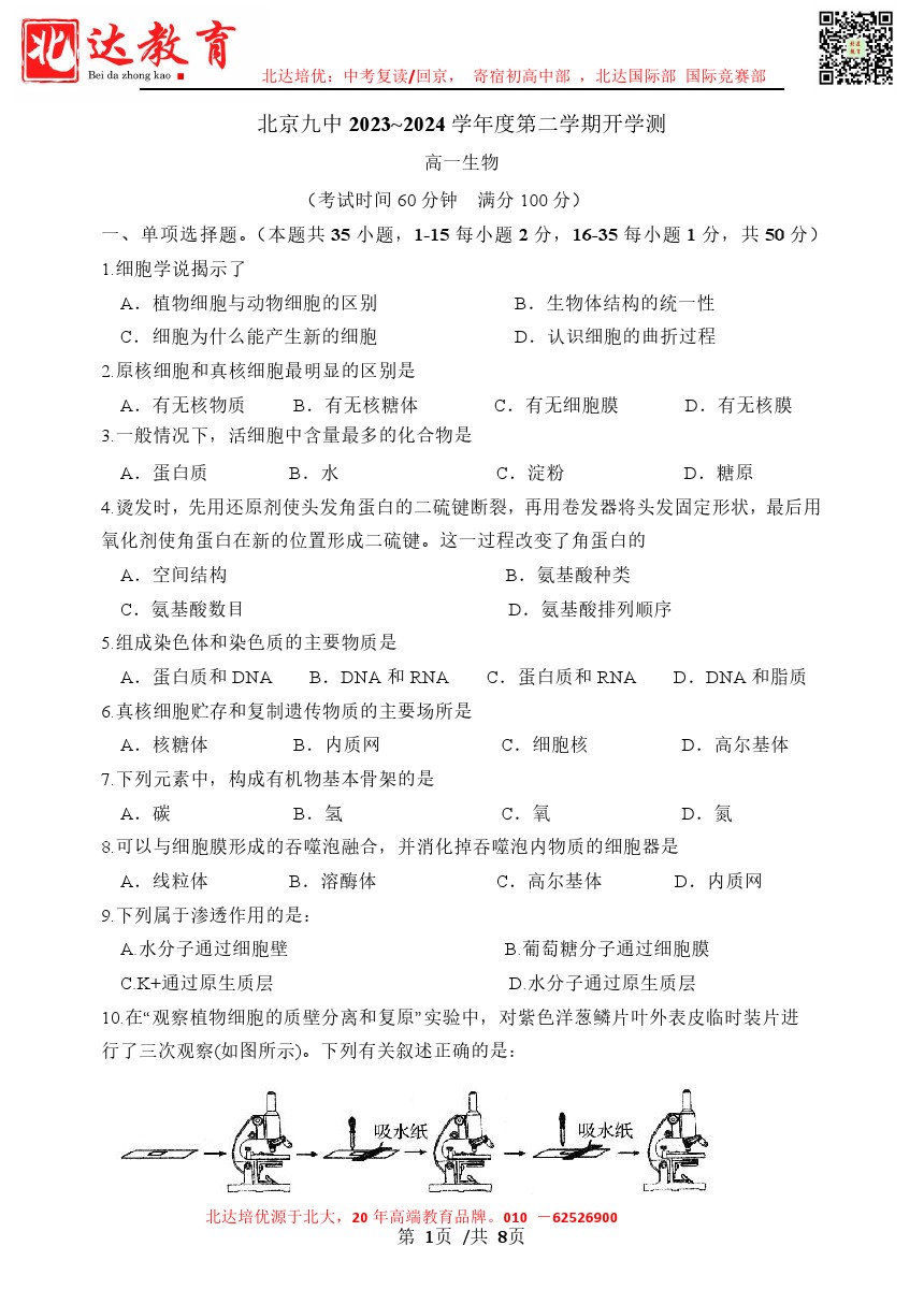 2024北京各中学高一开学考已结束,为了方便同学们查找相关试题,北达高考网特意整理了2024北京九中高一(下)开学考生物试题及答案,需要的同学赶紧下载练习吧。