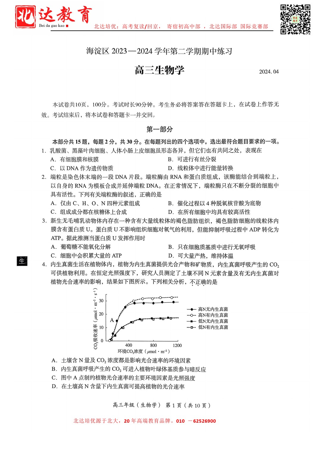 2024年北京海淀区区高三一模开考了,北达教研组收集并整理了2024北京海淀区高三一模生物试卷及答案,分享给同学们。
