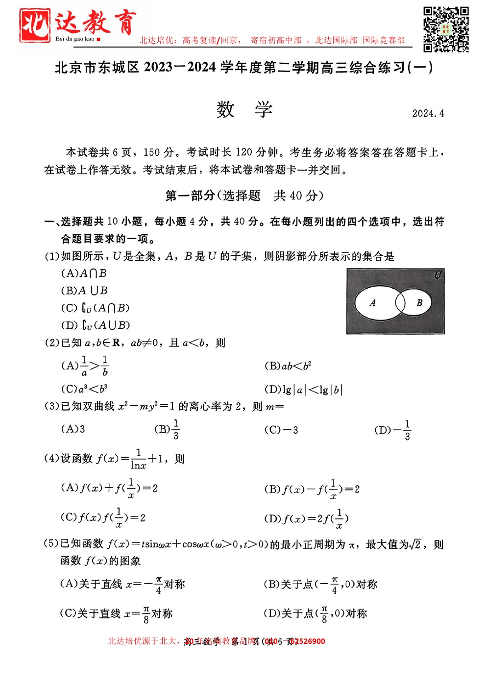 2024年北京东城区高三一模4月7日开考,北达教研组收集并整理了2024北京东城区高三一模数学试卷及答案,分享给同学们。