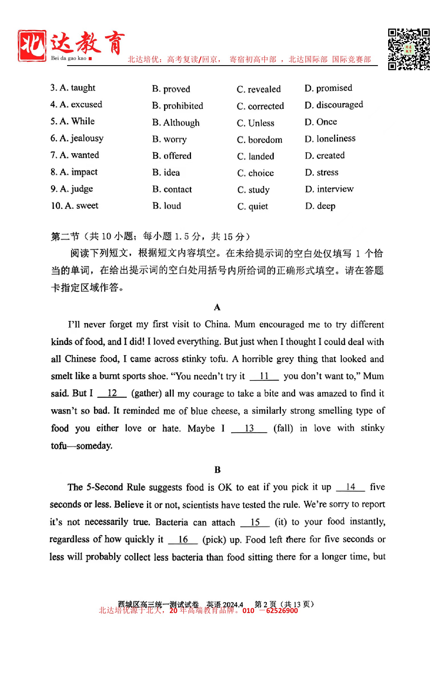 2024年北京西城区高三一模4月7日开考,北达教研组收集并整理了2024北京西城区高三一模英语试卷及答案,分享给同学们。