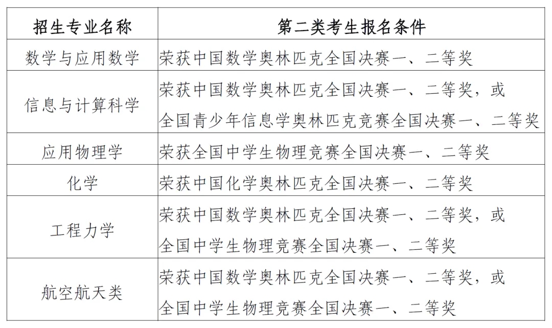 荣获全国青少年学科奥林匹克竞赛(数学、物理、化学、信息学)全国决赛一、二等奖。全国青少年学科奥林匹克竞赛获奖学生以全国青少年科技竞赛获奖名单公示网站(http://gs.cyscc.org/)公示的名单为准。各招生专业对应的报名条件如下表所示。