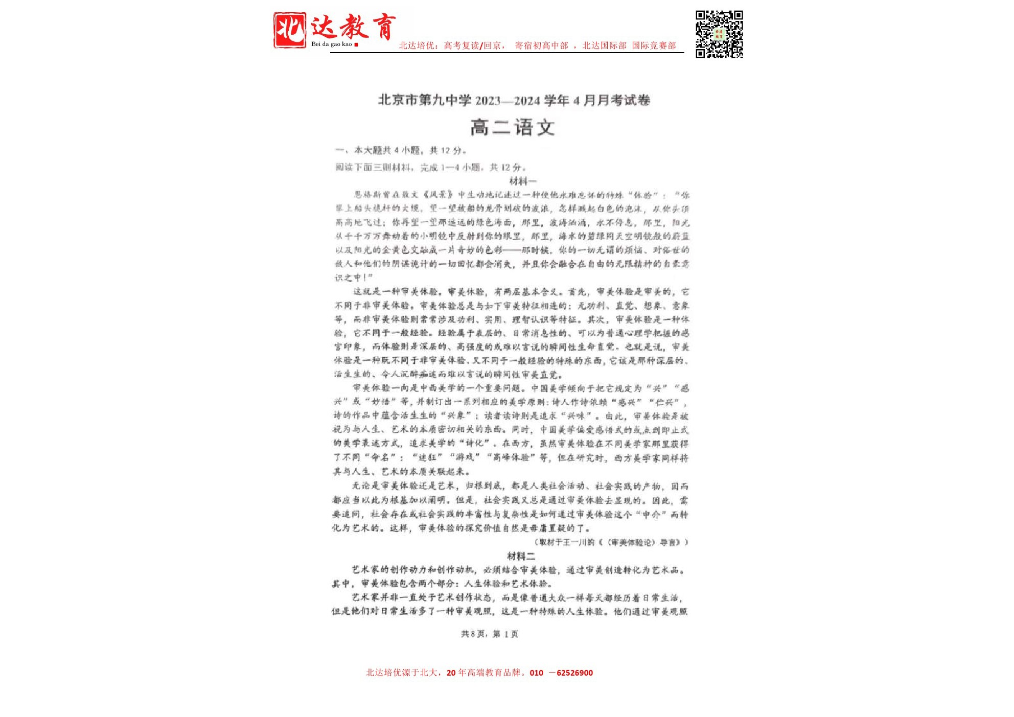 2024年北京各高中高二进行了4月月考测试,北达教研组收集并整理了2024北京九中高二4月月考语文试卷,分享给同学们。