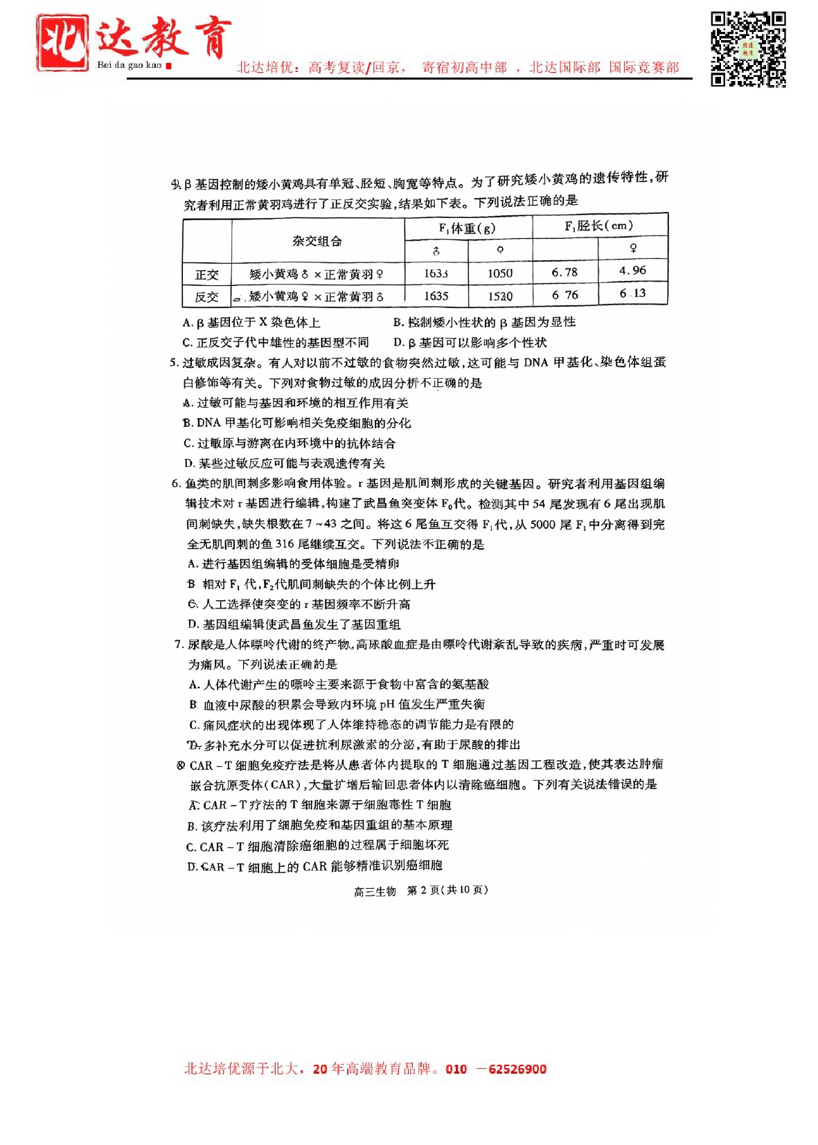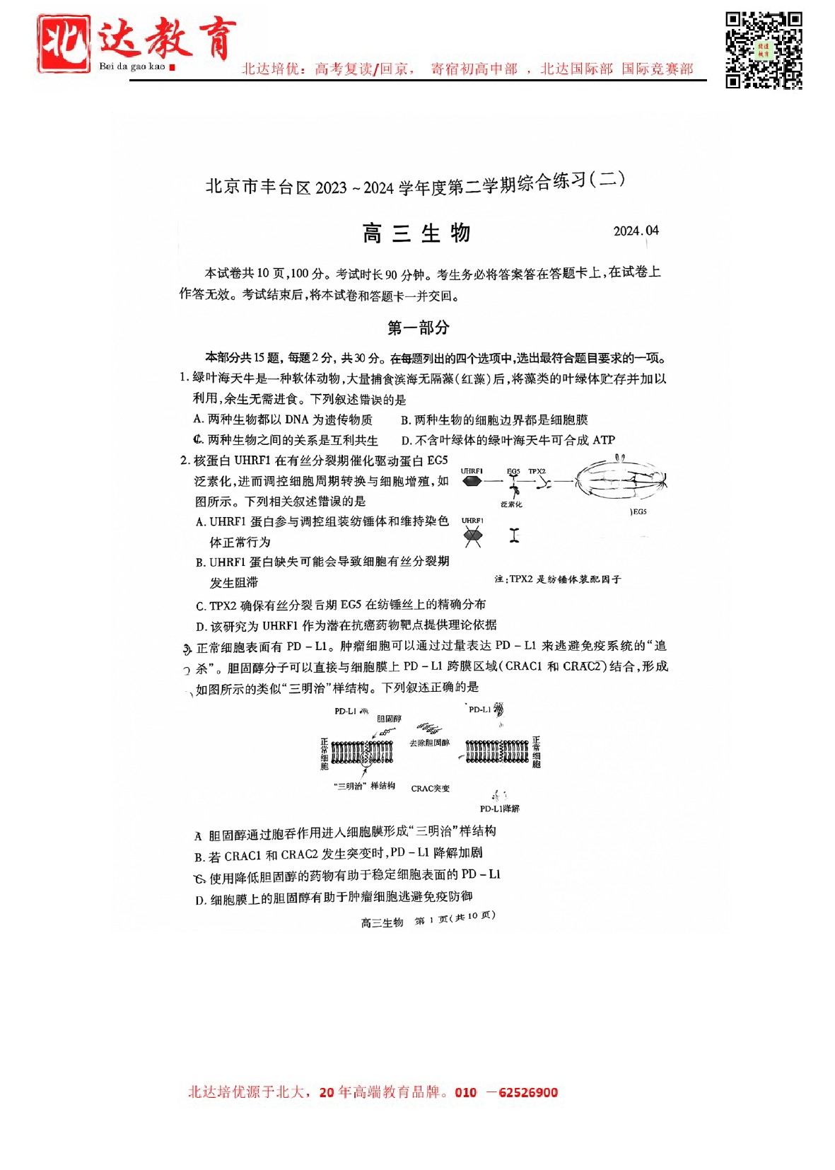 2024年北京丰台高三二模开考,北达教研组收集并整理了2024北京丰台高三二模生物试卷及答案,分享给同学们。