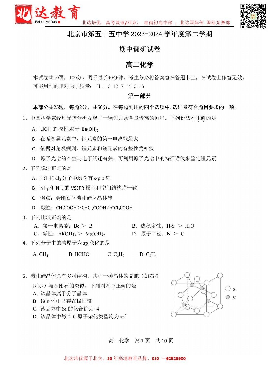 2024年北京五十五中高二(下)期中开考,北达教育整理了2024北京五十五中高二(下)期中化学试卷含答案,分享给同学们。