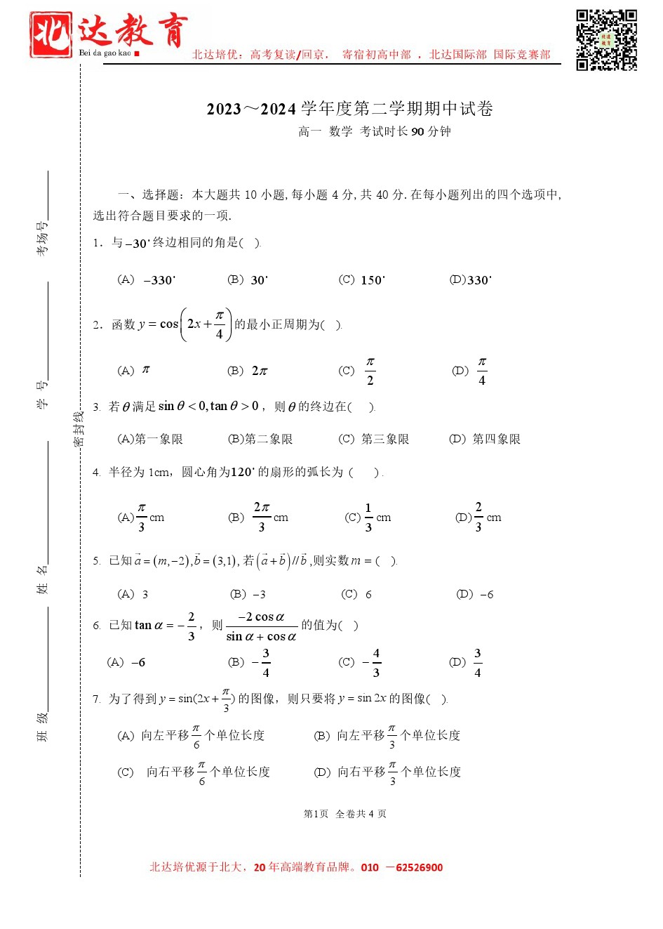 2024年北京八一学校高一(下)期中开考,北达教研组整理了2024北京八一学校高一(下)期中数学试卷含答案,分享给同学们。 导读推荐:2024北京各区高一(下)期中试题及答案汇总 北京北达全日制学校:中高考复…