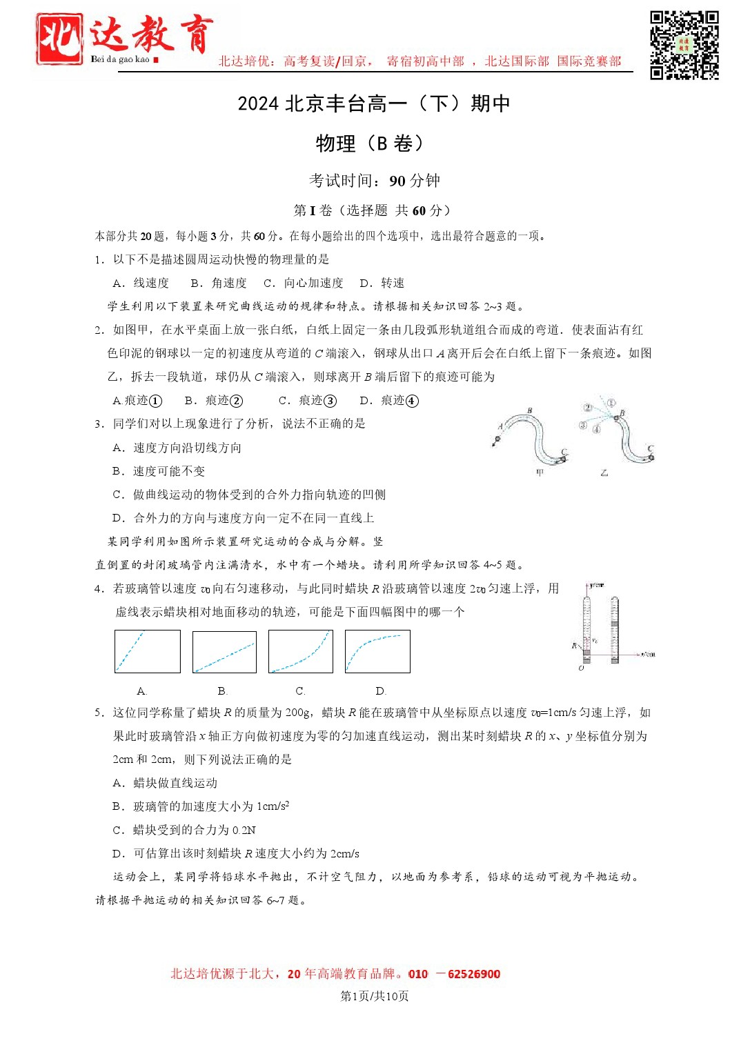 2024年北京丰台高一(下)期中开考,北达教研组整理了2024北京丰台高一(下)期中物理(B卷)试卷含答案,分享给同学们。 导读推荐:2024北京各区高一(下)期中试题及答案汇总 北京北达全日制学校:中高考复读…