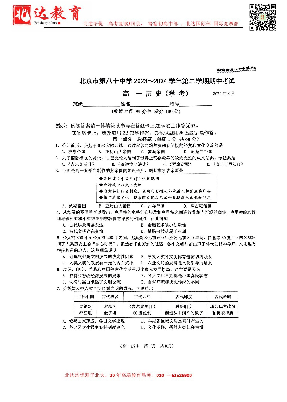 2024年北京八十中高一(下)期中开考,北达教研组整理了2024北京八十中高一(下)期中历史试卷,分享给同学们。
