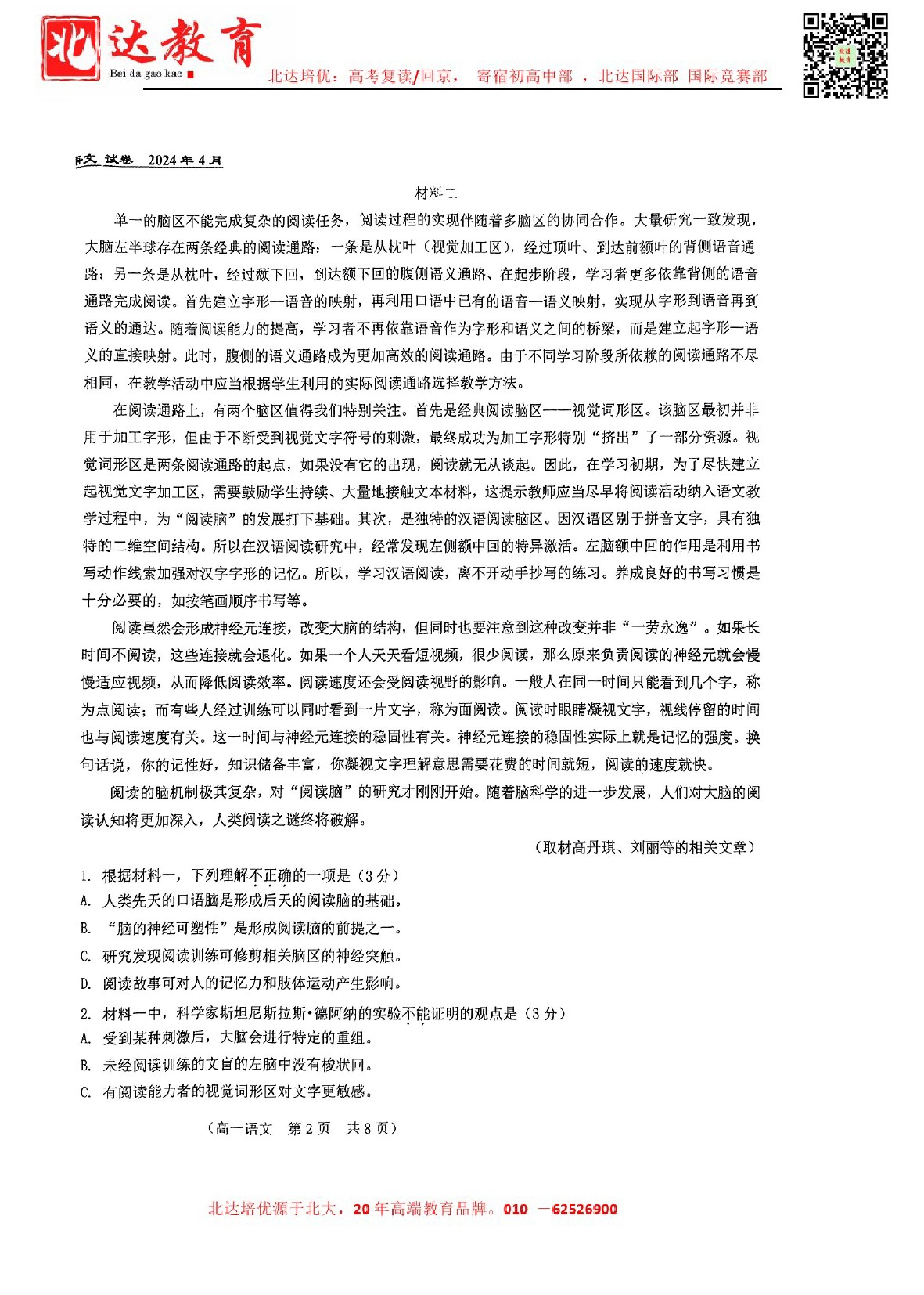 2024年北京八十中高一(下)期中开考,北达教研组整理了2024北京八十中高一(下)期中语文试卷,分享给同学们。