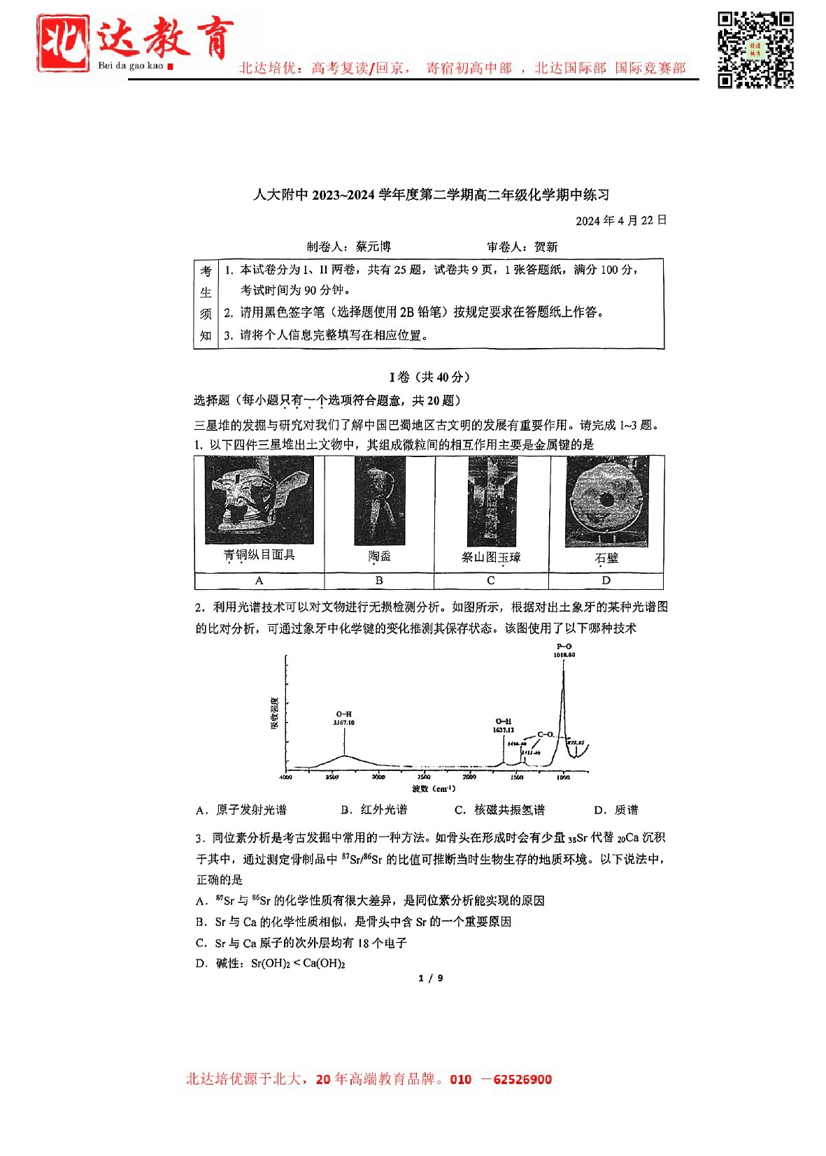 2024年北京人大附中高二(下)期中开考,北达教育整理了2024北京人大附中高二(下)期中化学试卷,分享给同学们。