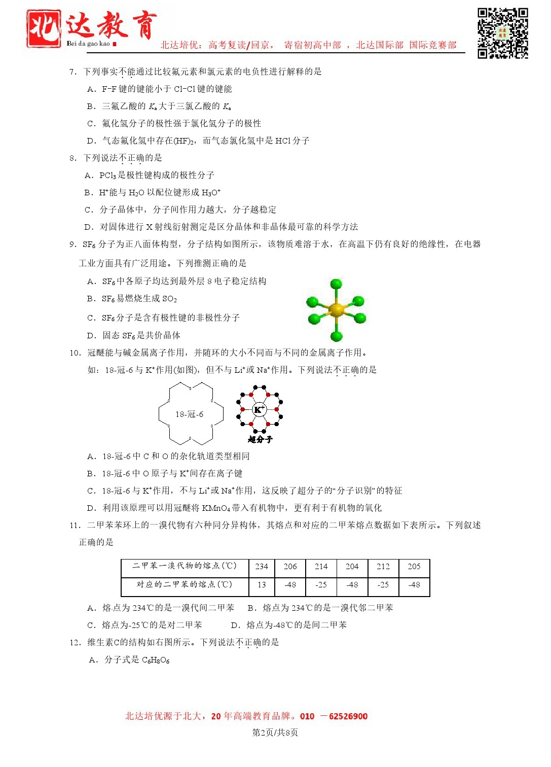 2024年北京北师大附中高二(下)期中开考,北达教育整理了2024北京北师大二附中高二(下)期中化学试卷含答案,分享给同学们。 导读推荐:2024北京各区高二(下)期中试题及答案汇…