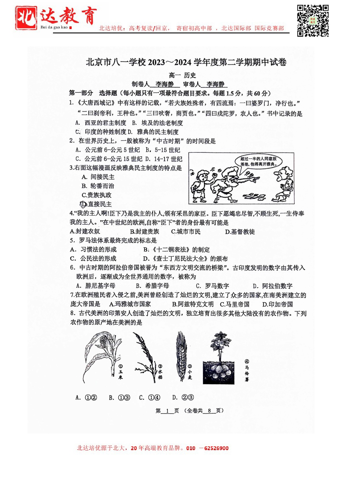 2024年北京八一学校高一(下)期中开考,北达教研组整理了2024北京八一学校高一(下)期中历史试卷含答案,分享给同学们。