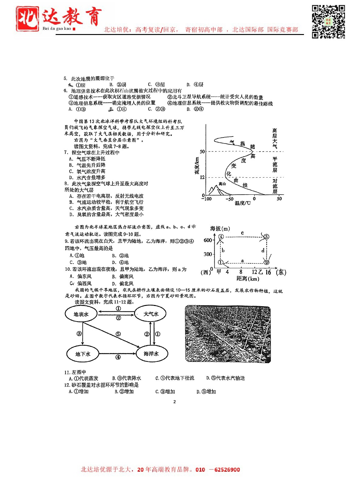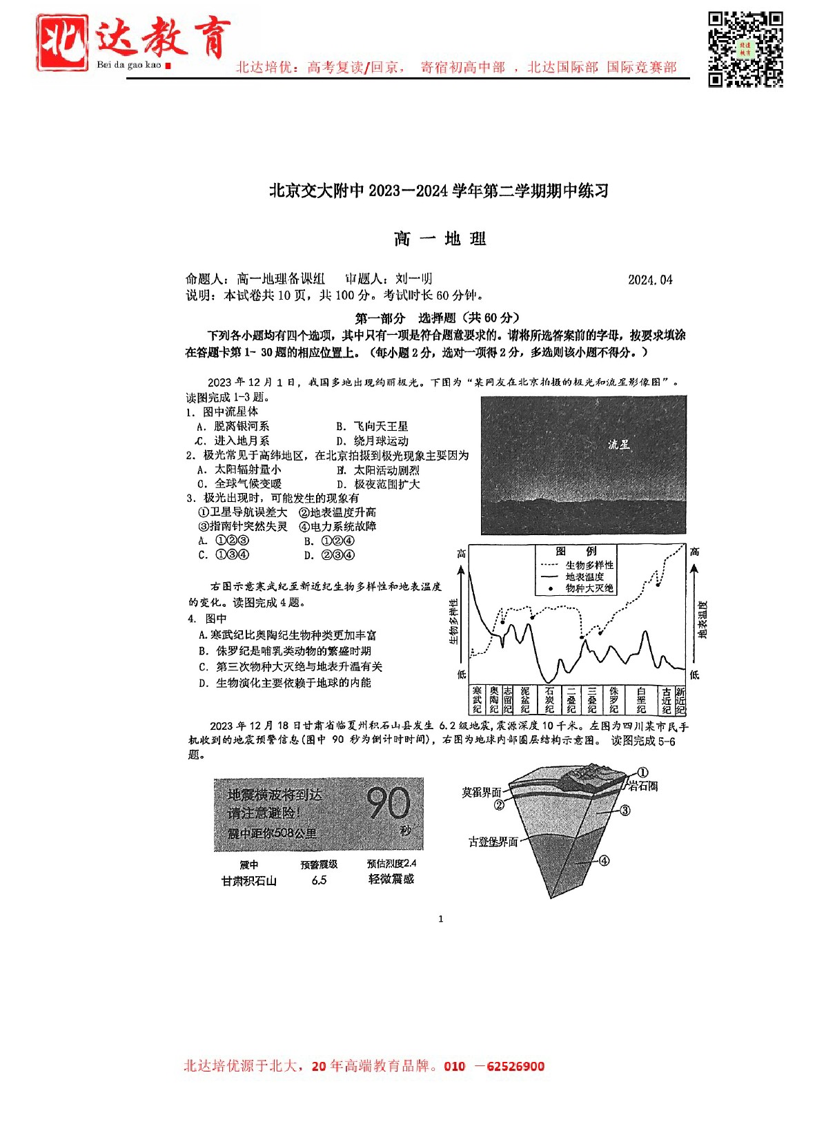 2024年北京交大附中高一(下)期中开考,北达教研组整理了2024北京交大附中高一(下)期中地理试卷含答案,分享给同学们。