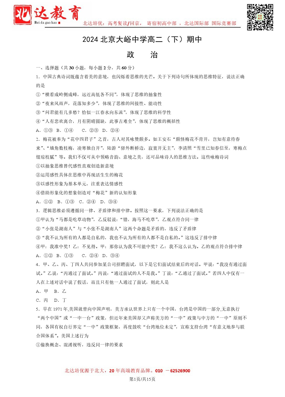 2024年北京大峪中学高二(下)期中开考,北达教育整理了2024北京大峪中学高二(下)期中政治试卷含答案,分享给同学们。 导读推荐:2024北京各区高二(下)期中试题及答案汇总 试…