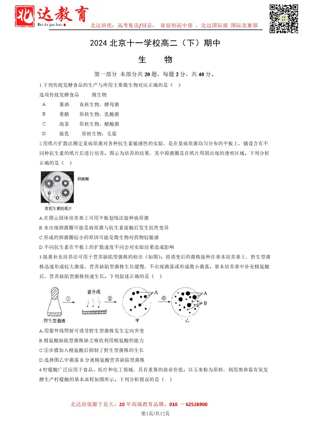 2024年北京十一学校高二(下)期中开考,北达教育整理了2024北京十一学校高二(下)期中生物试卷含答案,分享给同学们。
