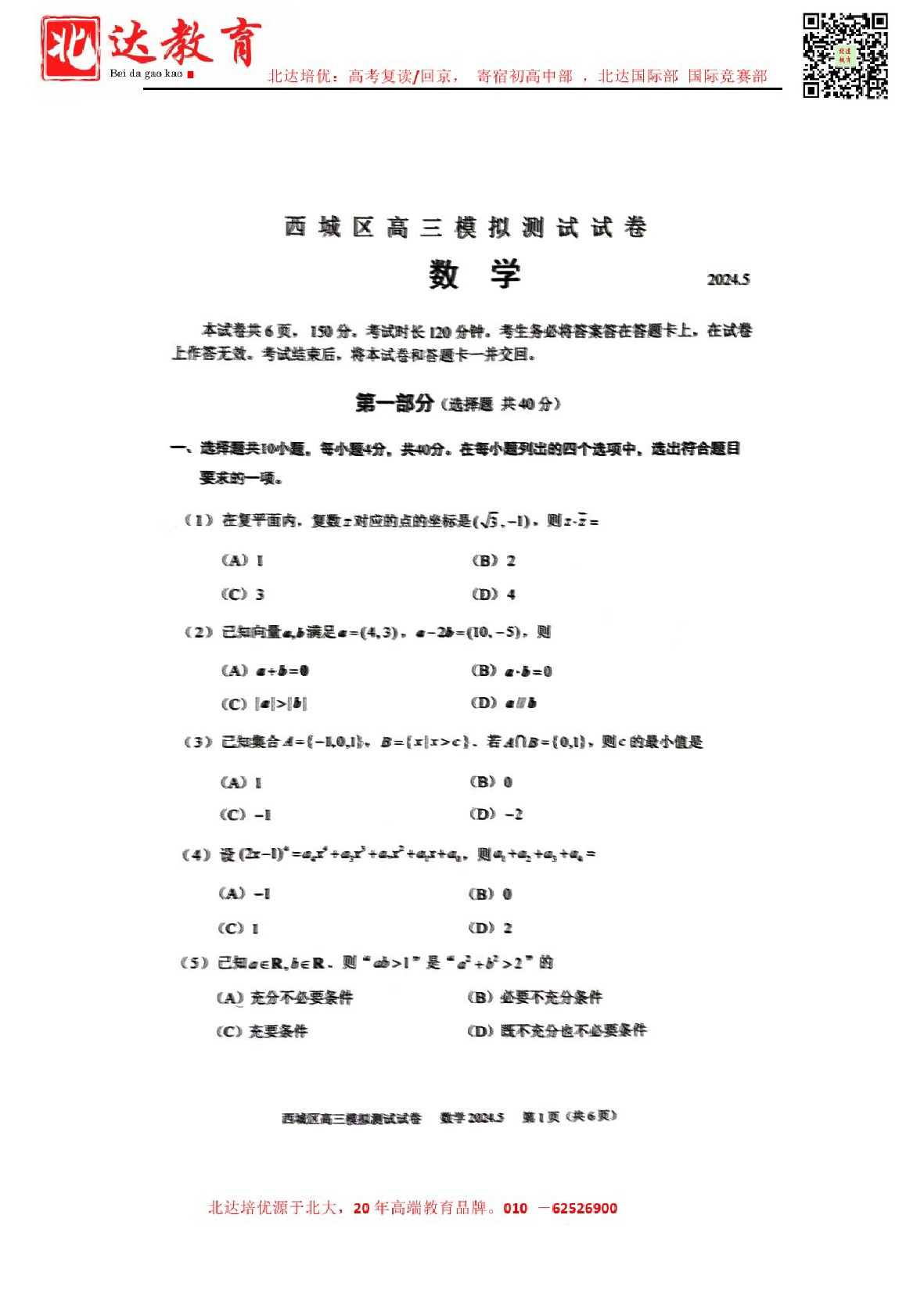 2024年北京西城高三二模开考,北达教研组收集并整理了2024北京西城高三二模数学试卷及答案,分享给同学们。