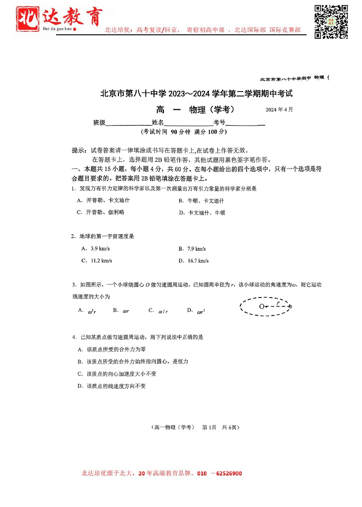 2024年北京八十中高一(下)期中开考,北达教研组整理了2024北京八十中高一(下)期中物理试卷,分享给同学们。 导读推荐:2024北京各区高一(下)期中试题及答案汇总 北京北达全日制学校:中高考复读,外地回…